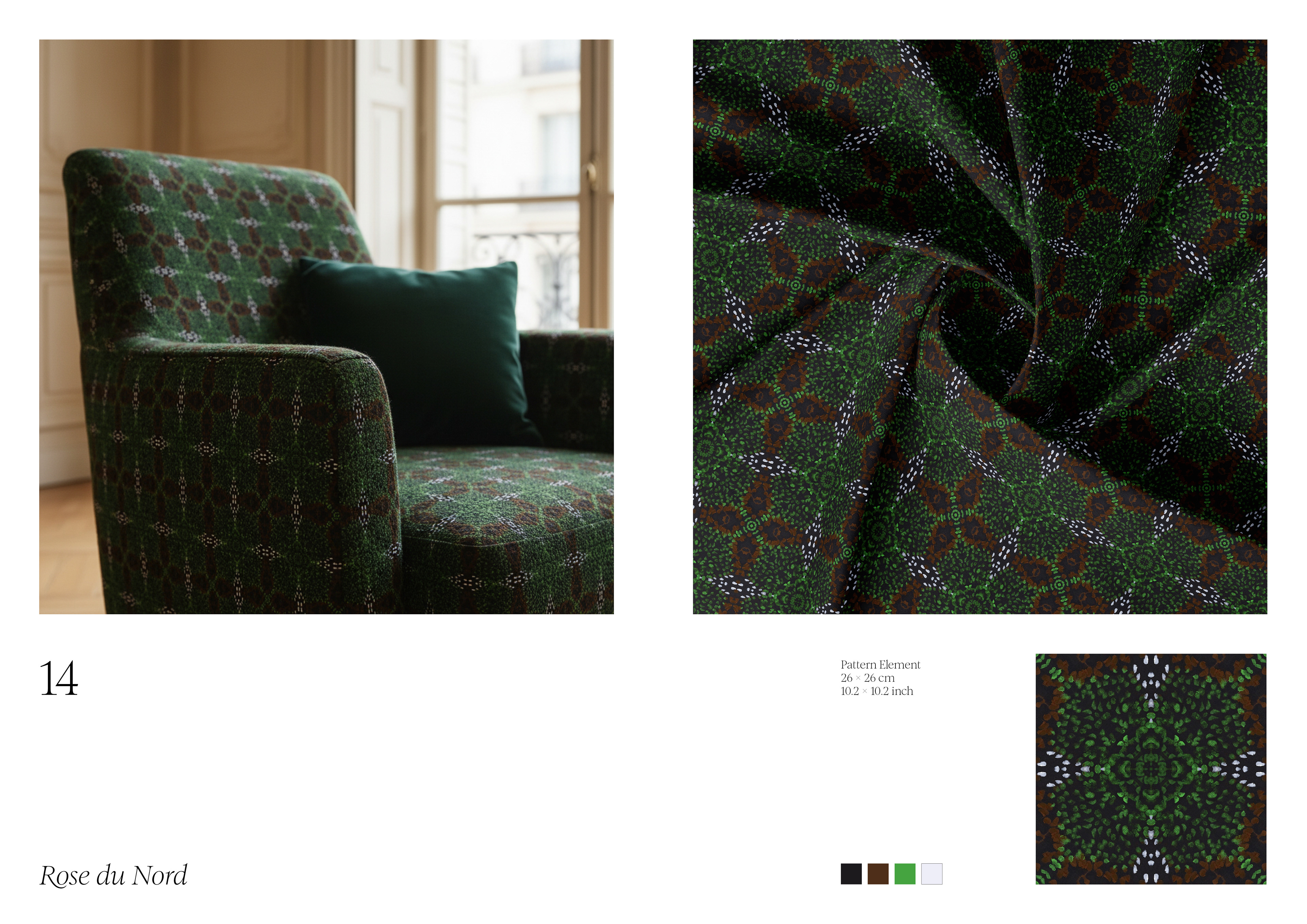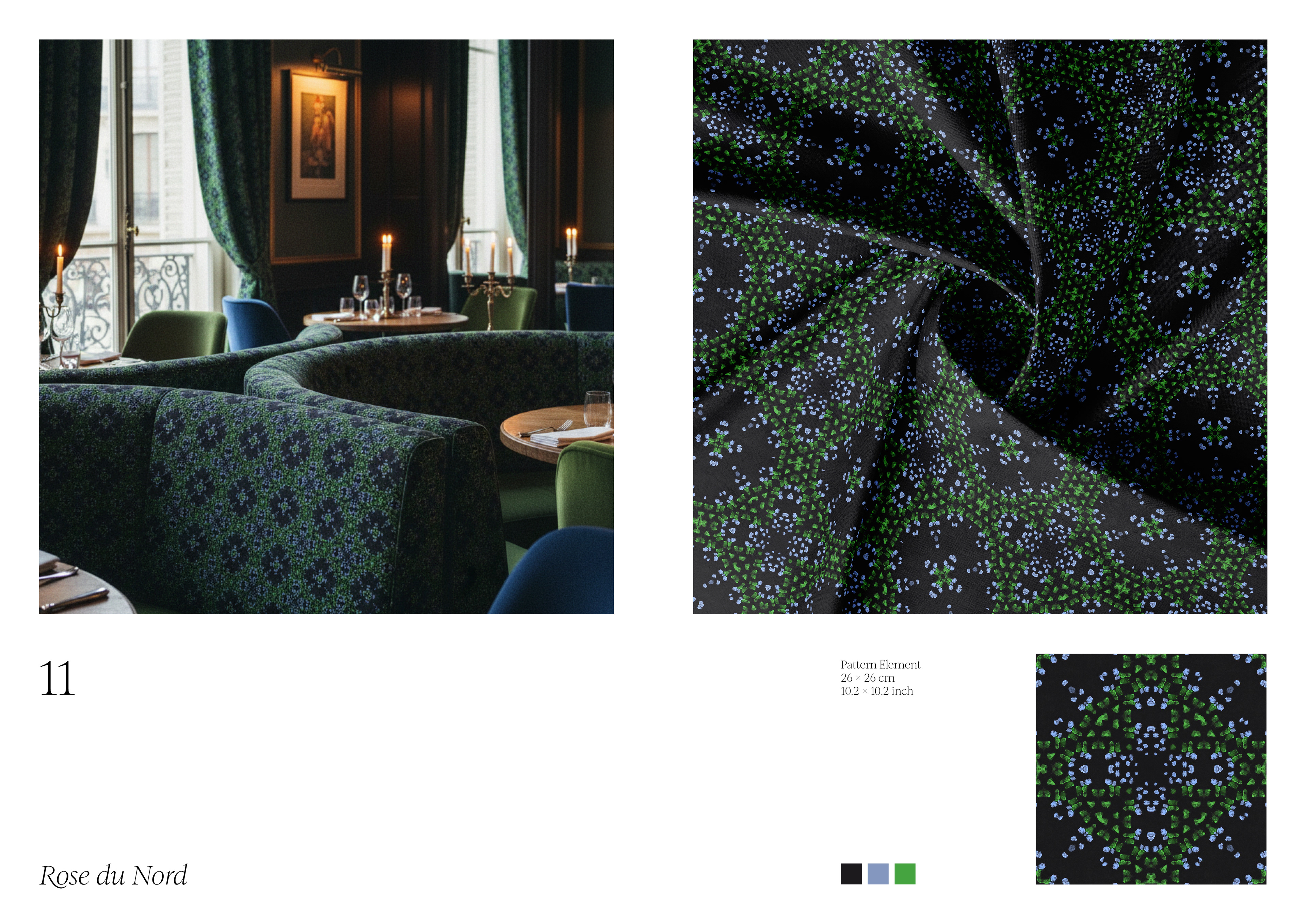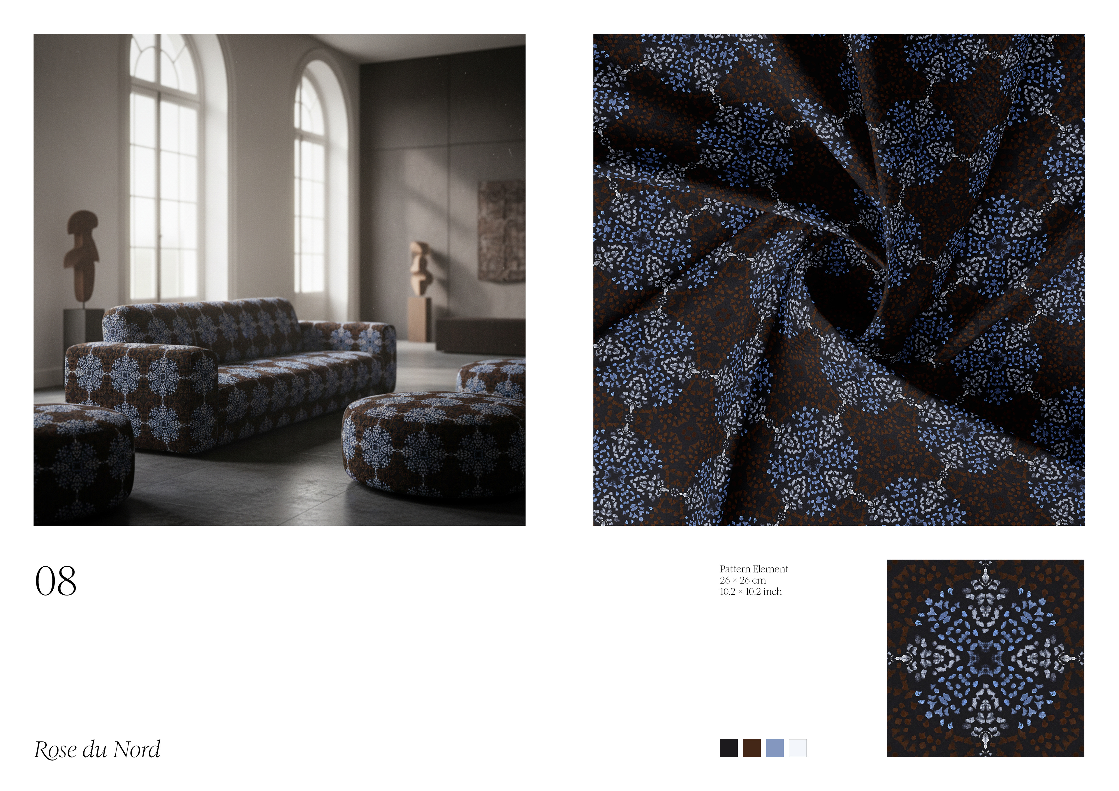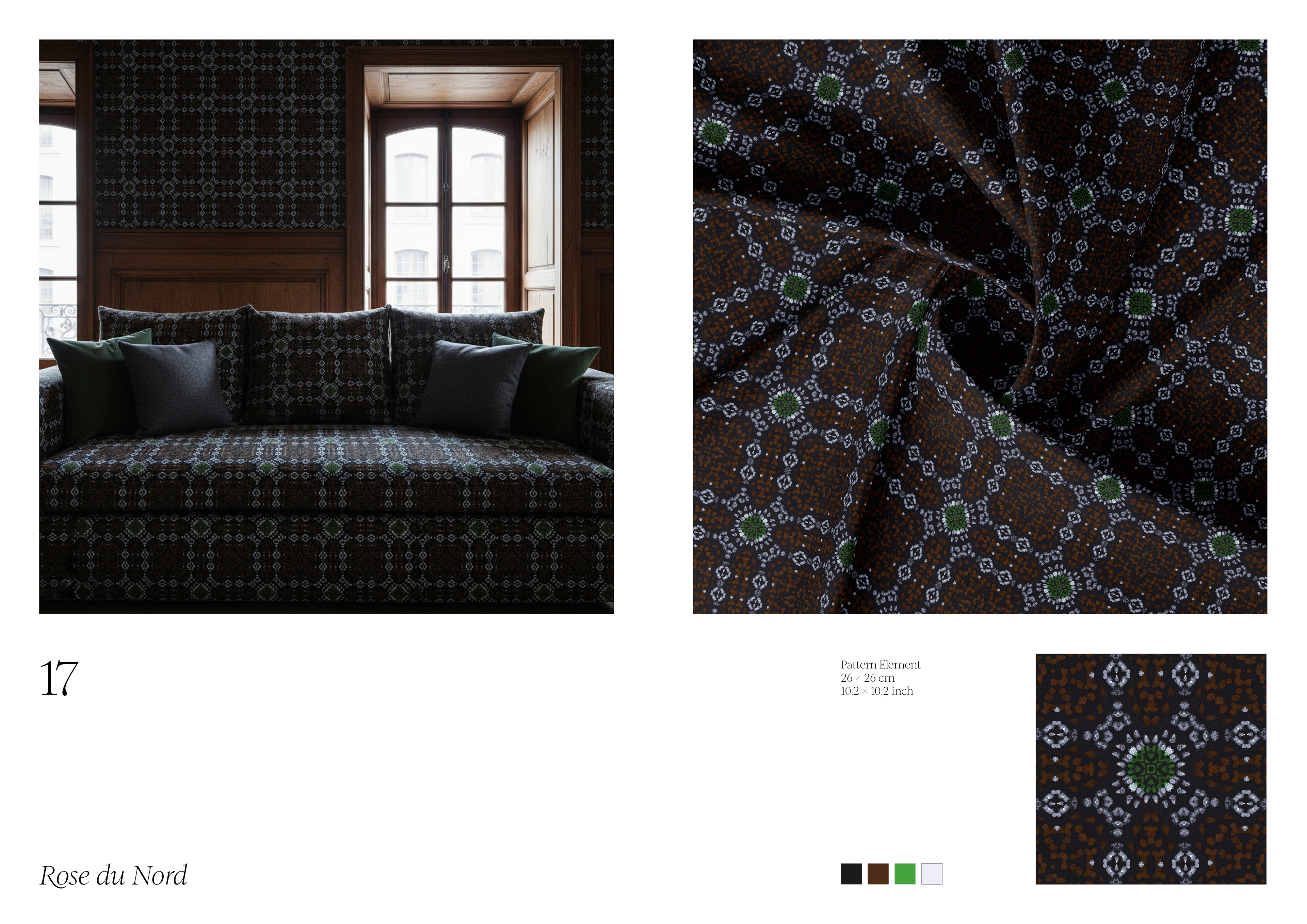 Rose du Nord is a collection of 28 ornamental patterns conceived for upholstery fabrics, wall coverings, and architectural surfaces. Inspired by northern landscapes and shaped by rosettes, the designs evoke an atmosphere where night triumphs. From this darkness emerge restrained palettes — the blue of shadows cast on snow, the brown of earth and shorelines, the green of moss and northern lights, the ochre of autumnal light, and the white of fragile crystals. The patterns read as a graphic lace through a delicate language of dots. Applied by hand, each mark retains a subtle irregularity, a tactile vibration that speaks to craft. Designed to adapt effortlessly across scales and surfaces — from furniture to walls — the collection embraces sustainable and timeless vision of ornament.