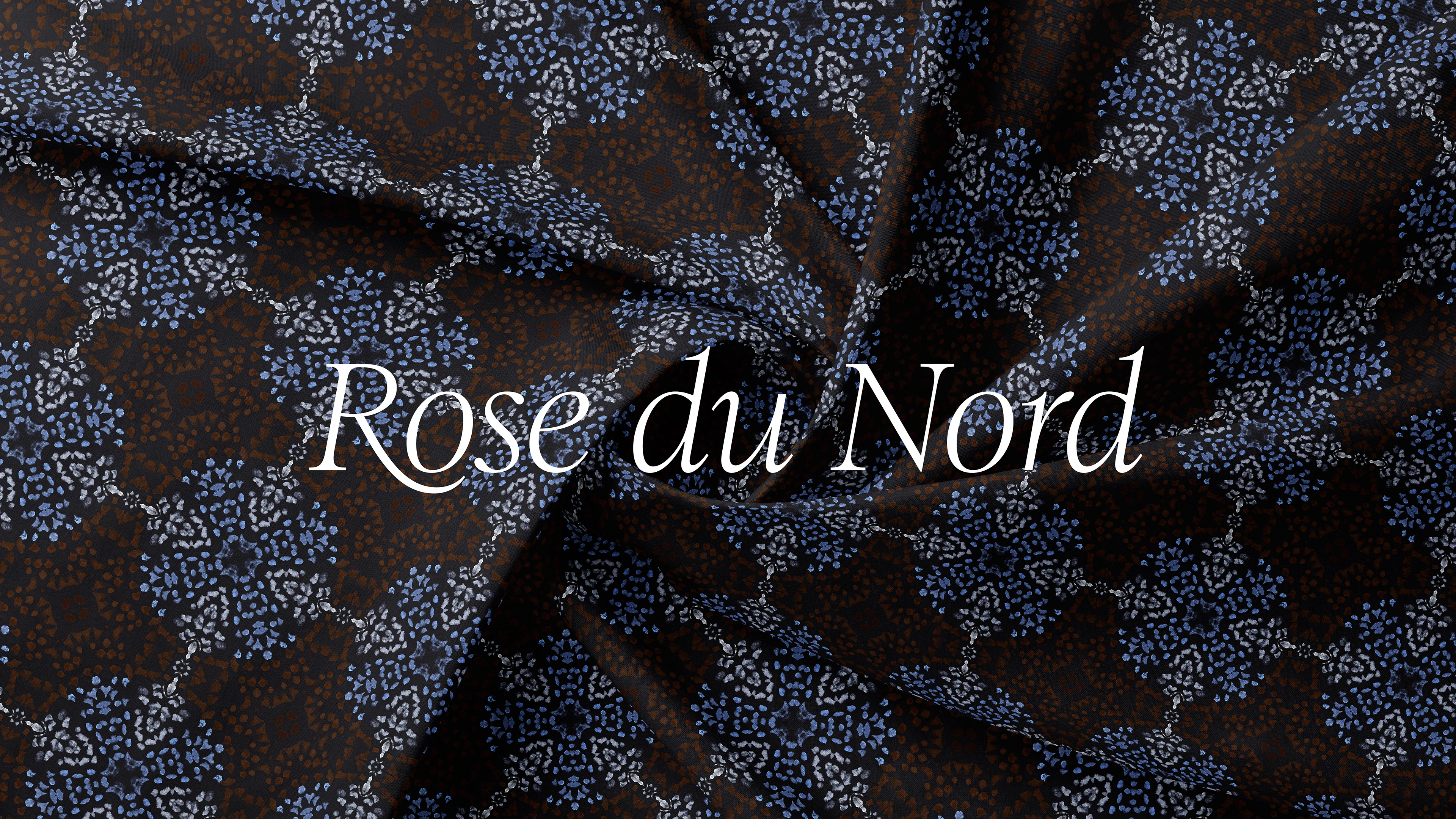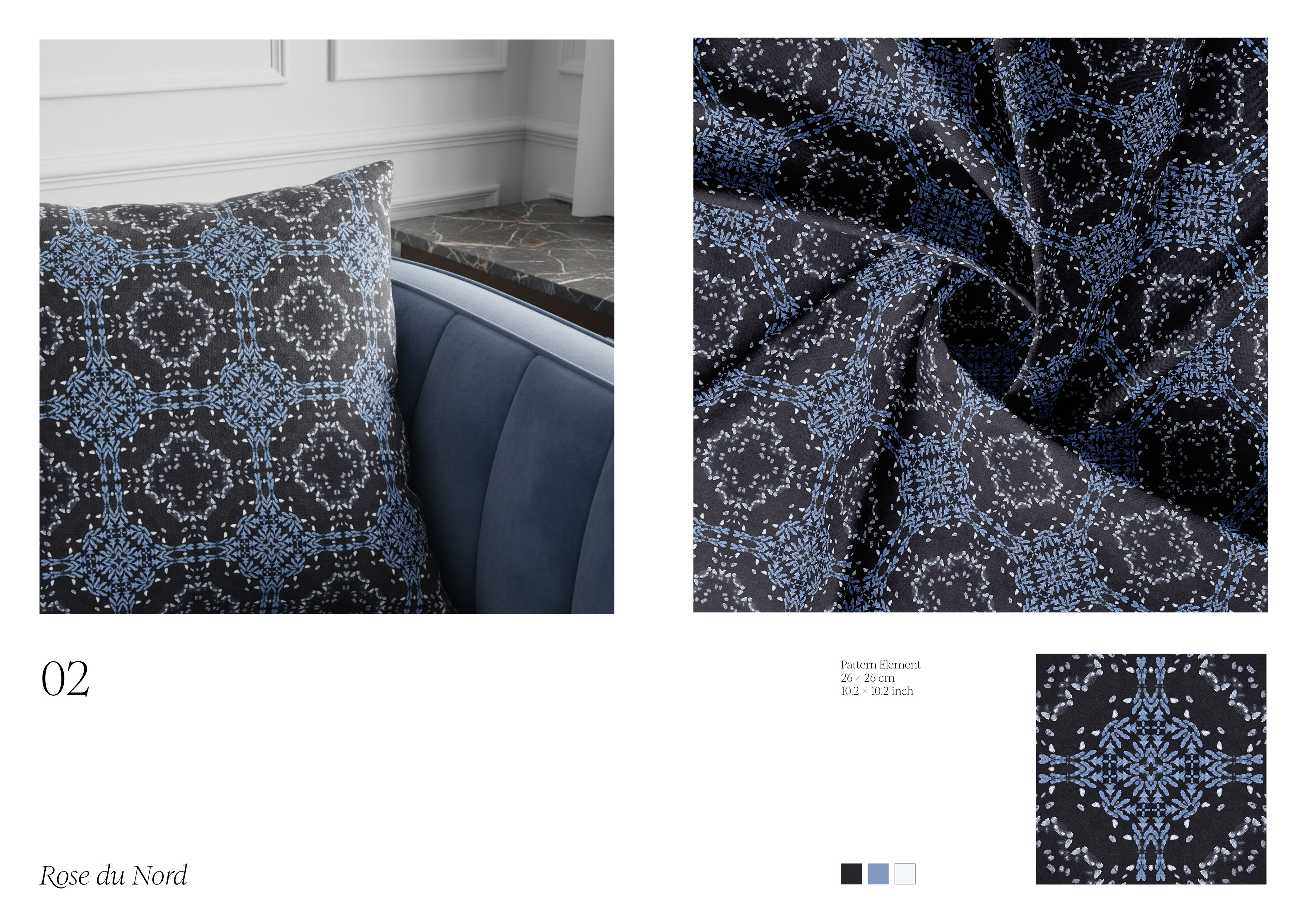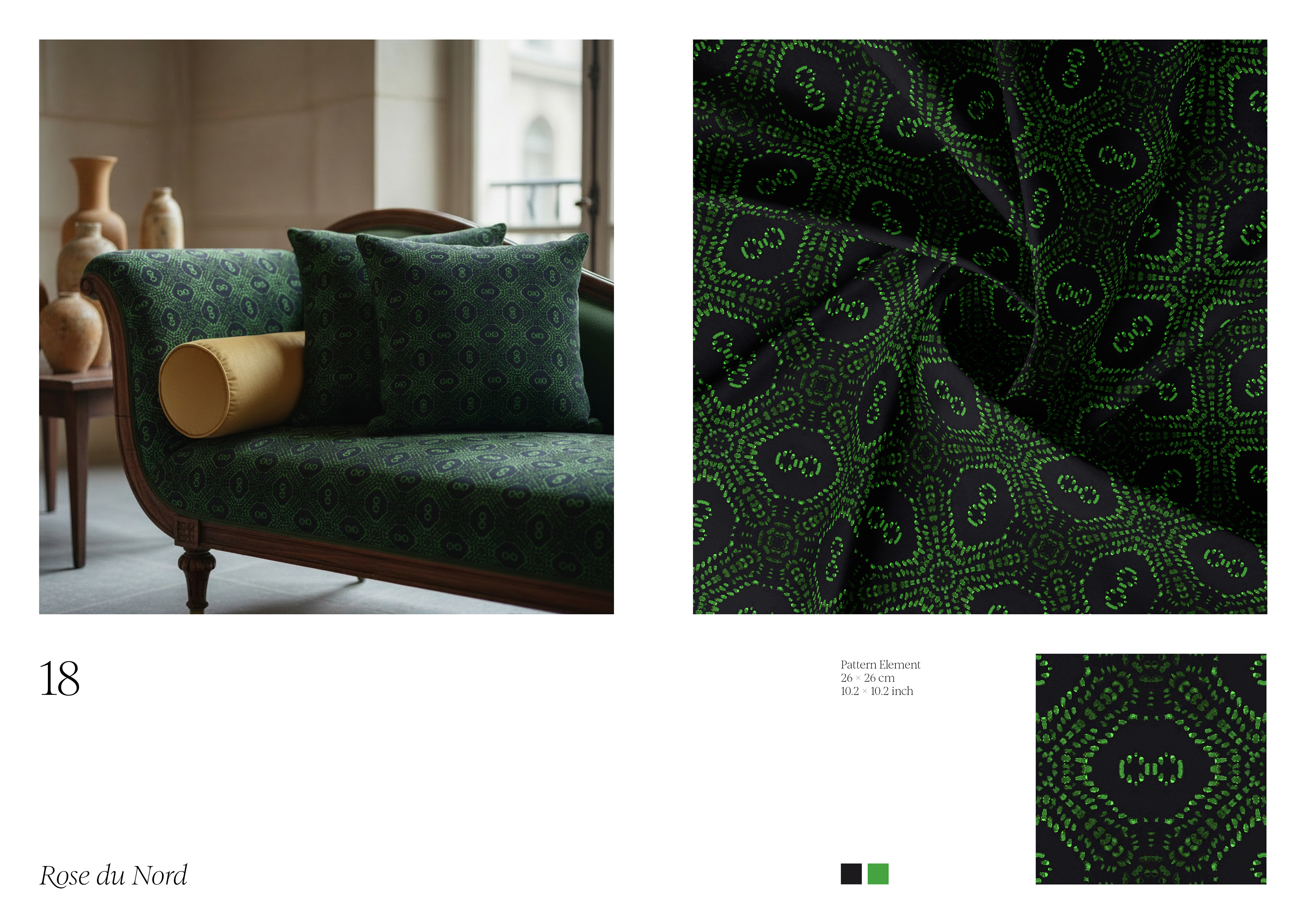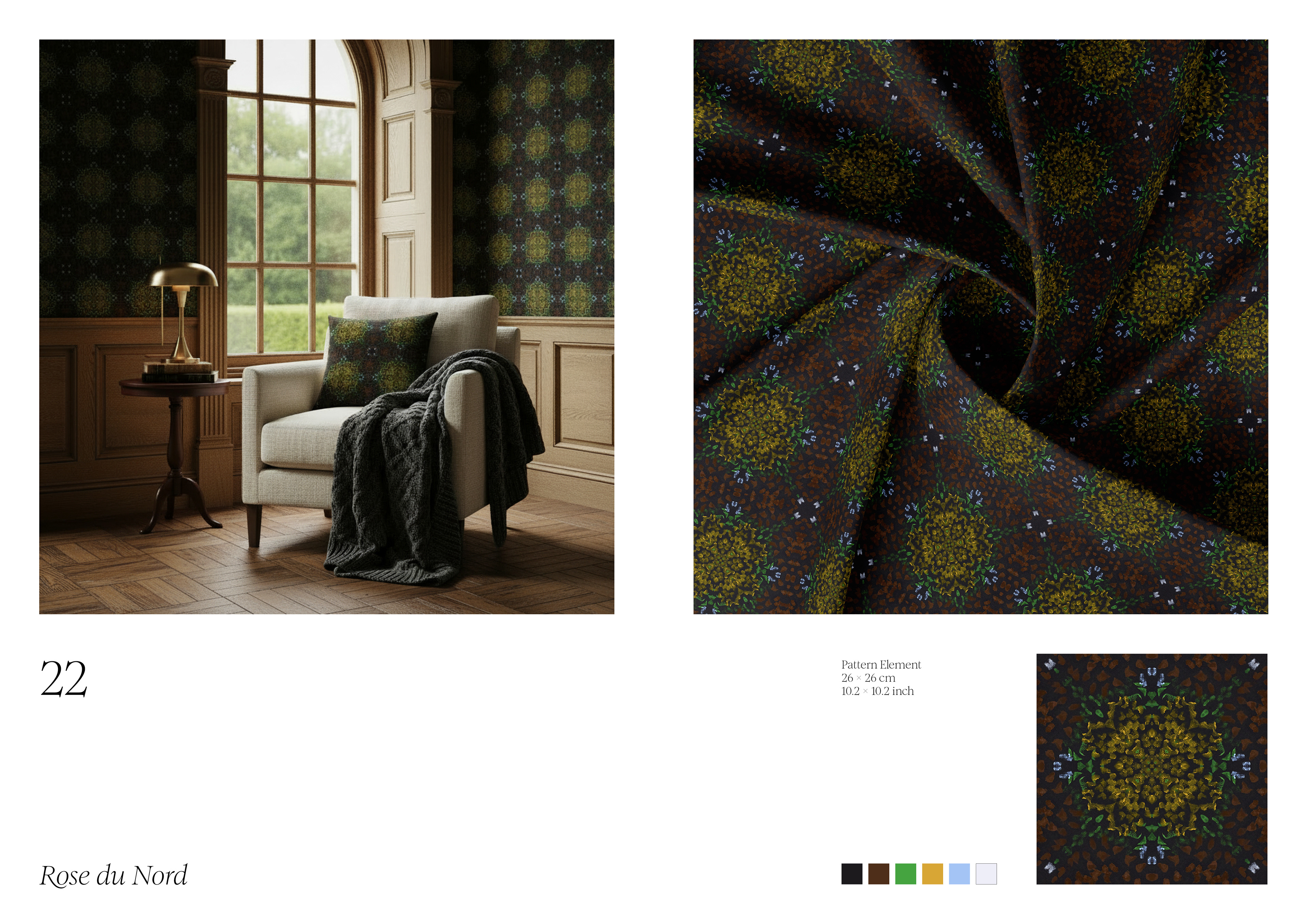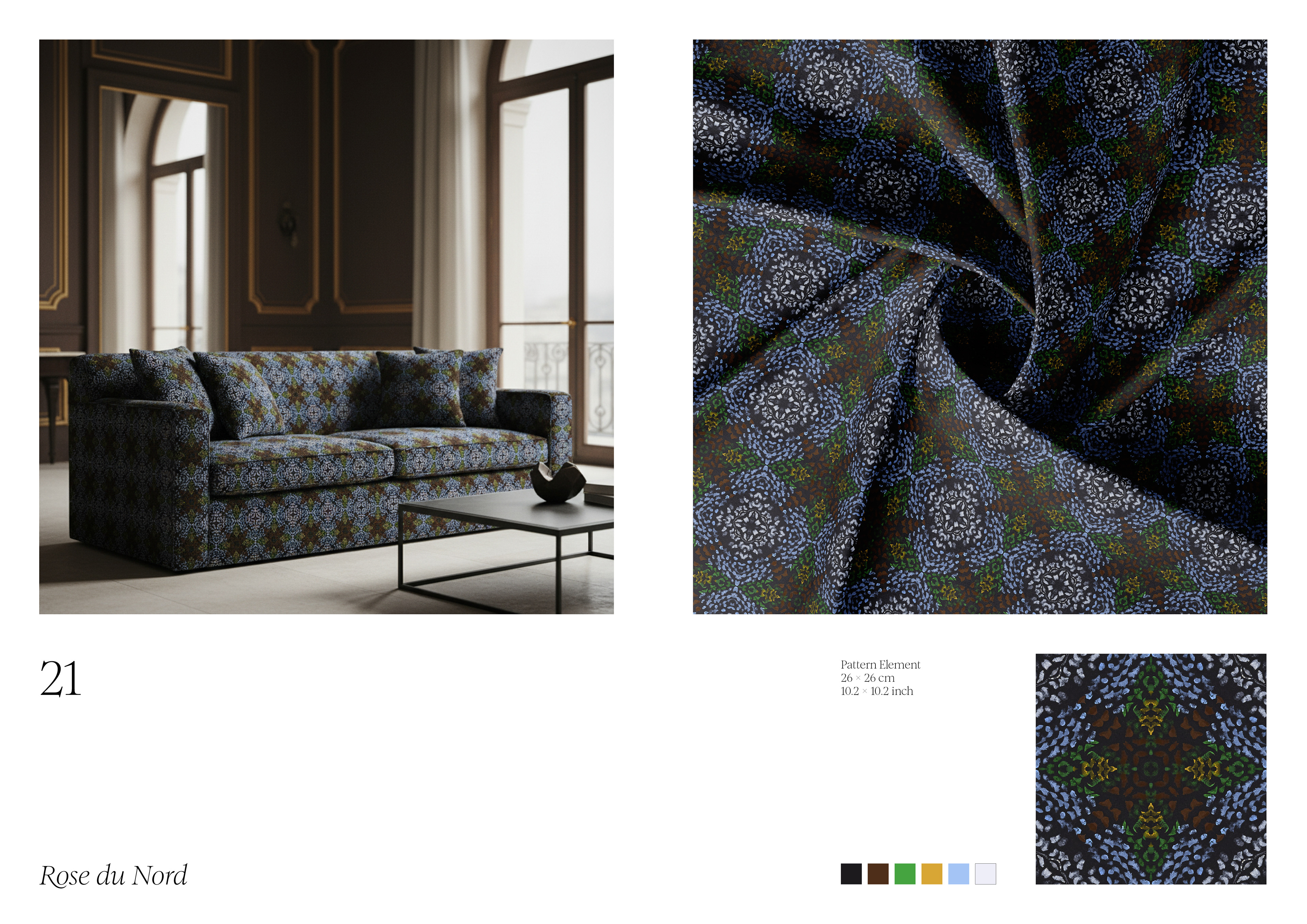 Rose du Nord is a collection of 28 ornamental patterns conceived for upholstery fabrics, wall coverings, and architectural surfaces. Inspired by northern landscapes and shaped by rosettes, the designs evoke an atmosphere where night triumphs. From this darkness emerge restrained palettes — the blue of shadows cast on snow, the brown of earth and shorelines, the green of moss and northern lights, the ochre of autumnal light, and the white of fragile crystals. The patterns read as a graphic lace through a delicate language of dots. Applied by hand, each mark retains a subtle irregularity, a tactile vibration that speaks to craft. Designed to adapt effortlessly across scales and surfaces — from furniture to walls — the collection embraces sustainable and timeless vision of ornament.