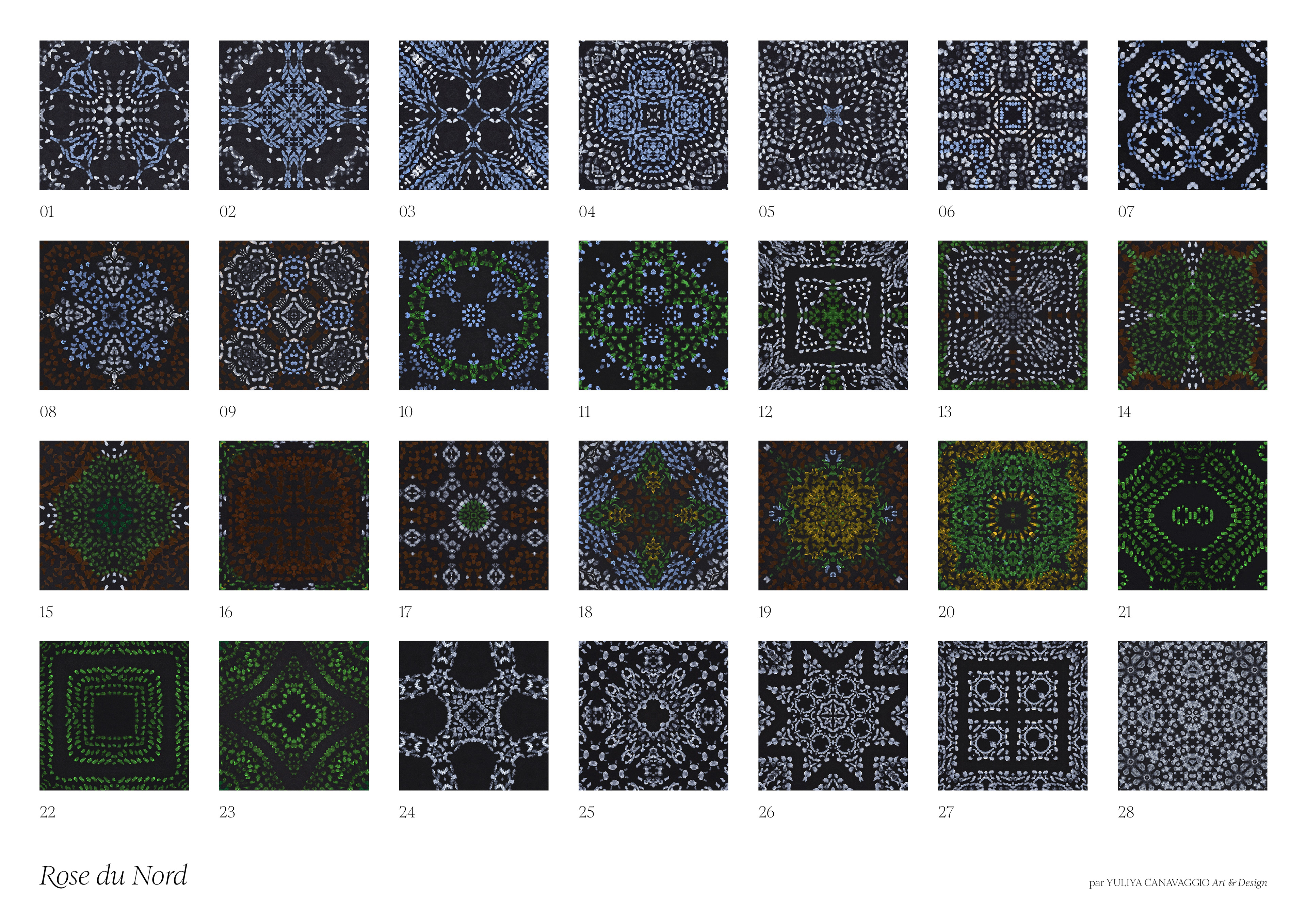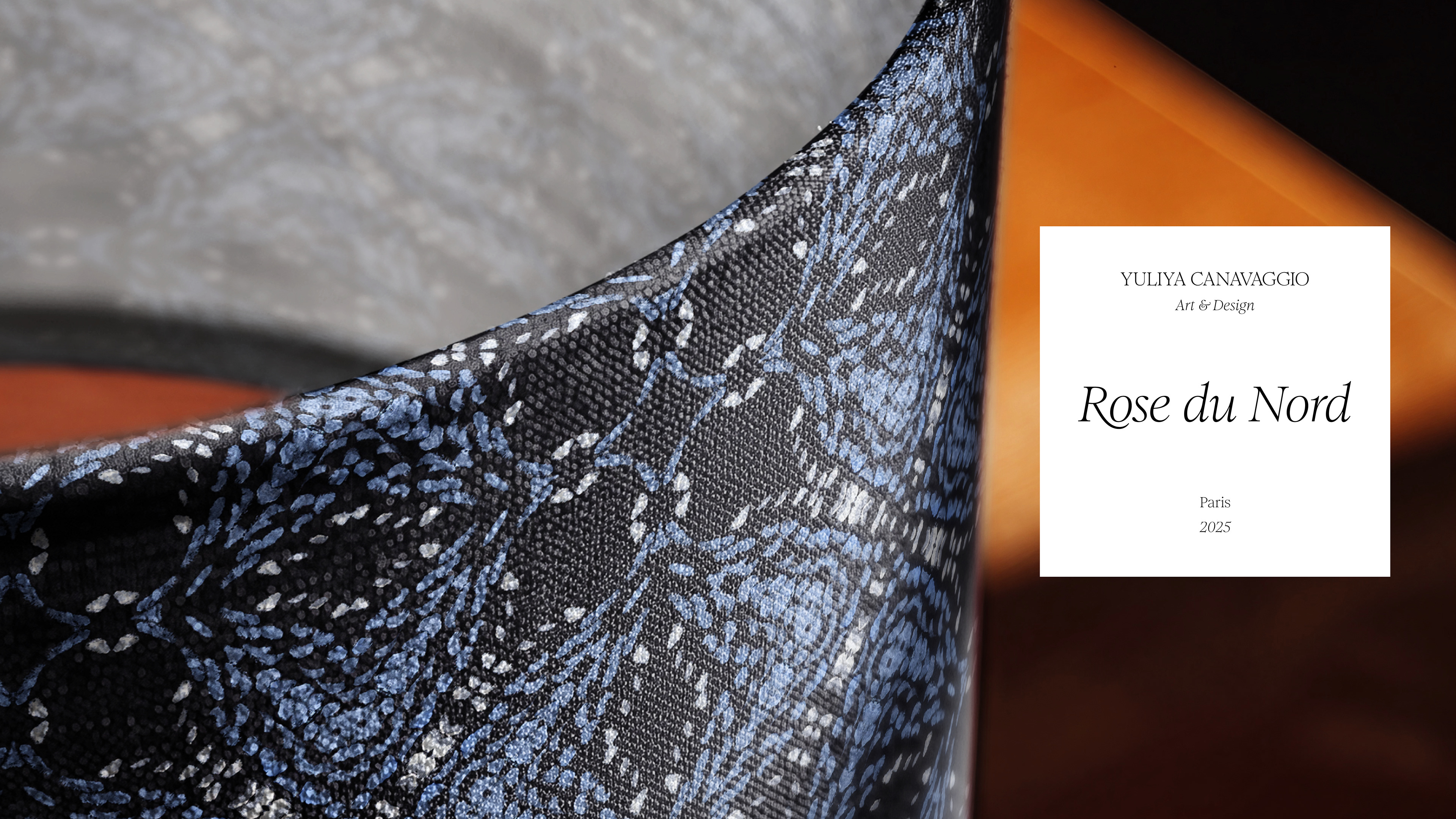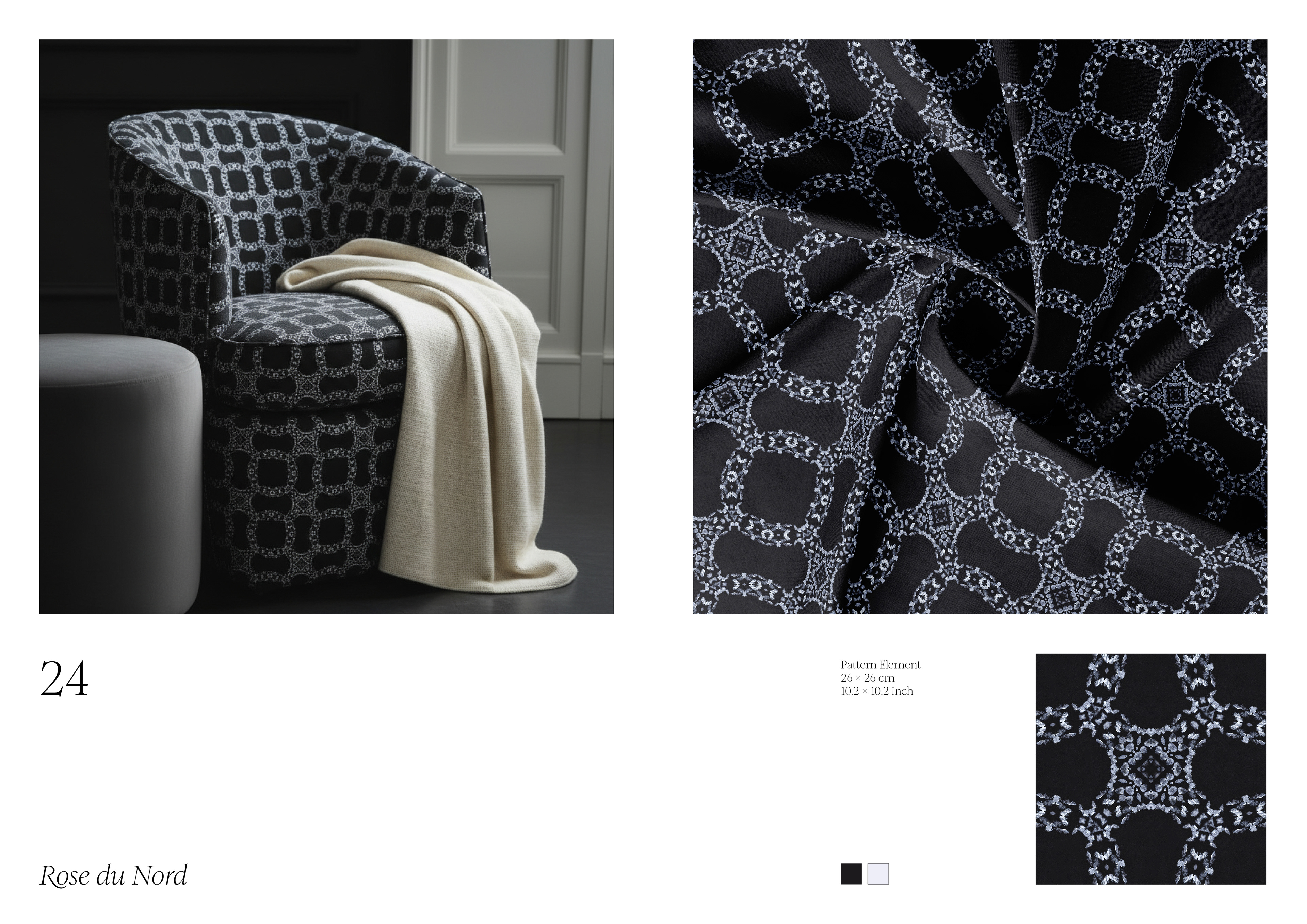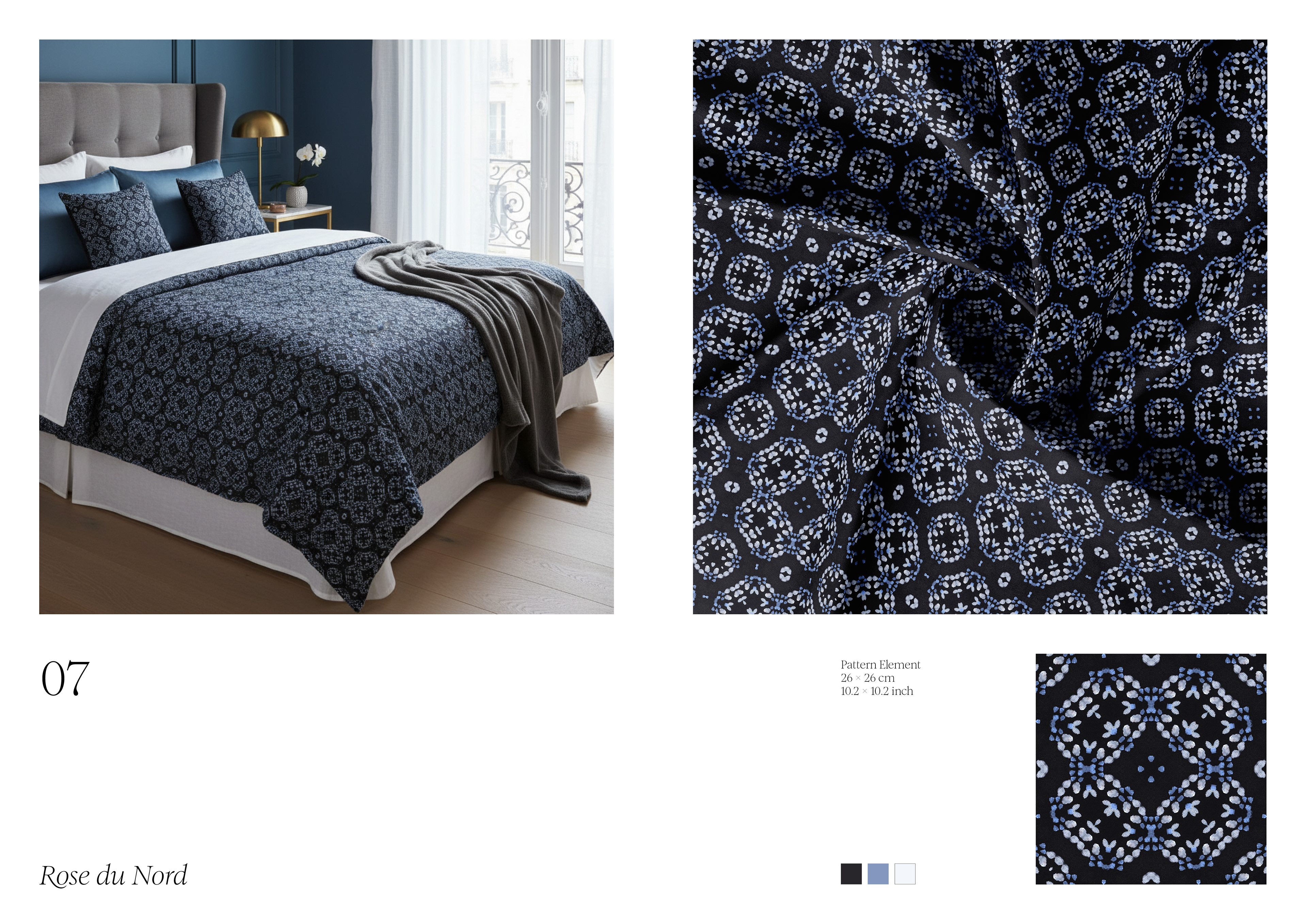 Rose du Nord is a collection of 28 ornamental patterns conceived for upholstery fabrics, wall coverings, and architectural surfaces. Inspired by northern landscapes and shaped by rosettes, the designs evoke an atmosphere where night triumphs. From this darkness emerge restrained palettes — the blue of shadows cast on snow, the brown of earth and shorelines, the green of moss and northern lights, the ochre of autumnal light, and the white of fragile crystals. The patterns read as a graphic lace through a delicate language of dots. Applied by hand, each mark retains a subtle irregularity, a tactile vibration that speaks to craft. Designed to adapt effortlessly across scales and surfaces — from furniture to walls — the collection embraces sustainable and timeless vision of ornament.